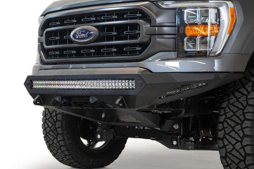 The Stealth Fighter is a plate steel bumper with a radiused front edge that keeps it tight to the truck. There is a universal light mount system in the center of the bumper that holds up to a 40" radius light bar or 10 cube lights. Each side panel has a mount capable of holding either a 10" single row light bar or a cube light. Reinforced clevis mounts provide a mounting point for 3/4" D-Rings, while the optional winch mount provides even more utility. Sensor cutouts make this bumper compatible with both sensor and non-sensor trucks. As always, this bumper is fully bolt-on and made in America.