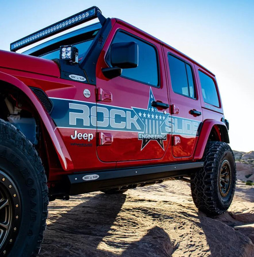 Rock Slide Engineering’s newly designed 3rd Generation Step Slider is next level. This fully functional, trail rated, rock slider is integrated with a power step for easy access for all demographics. An additional 2 inches on the back end of the step has been added to this generation for better, safer access to the rear door.